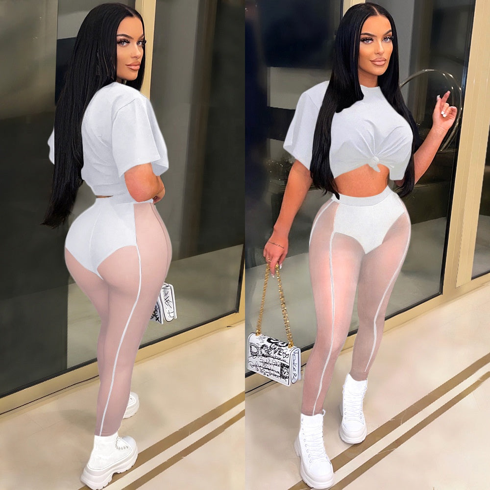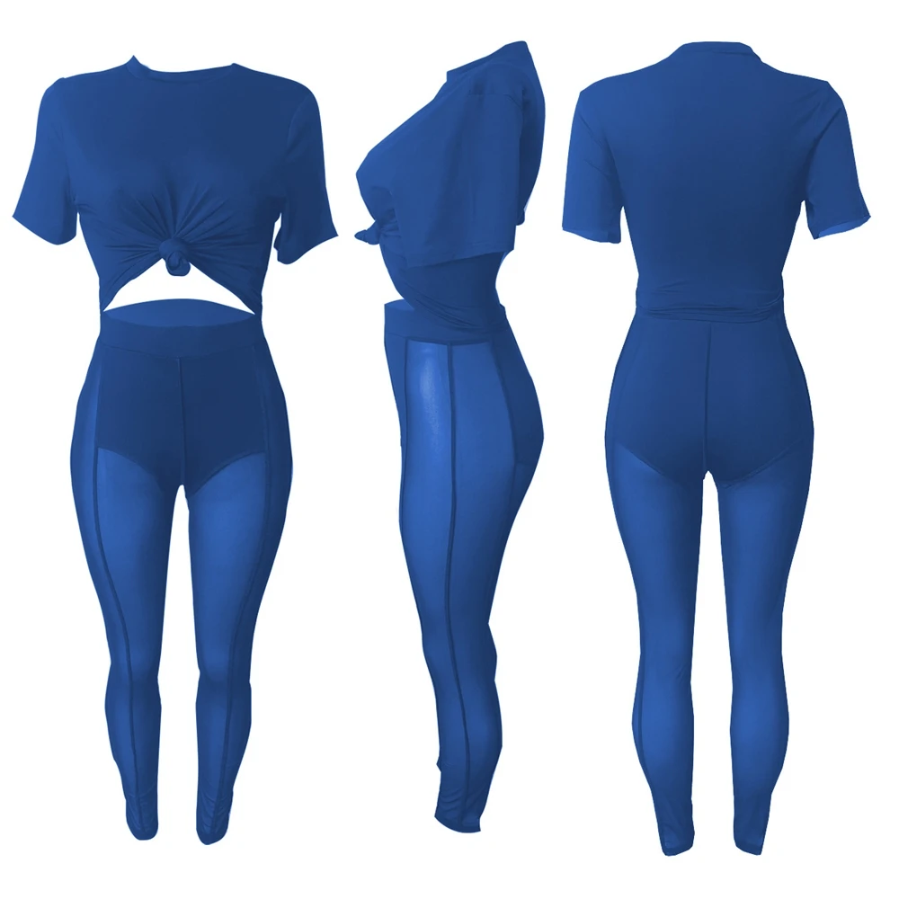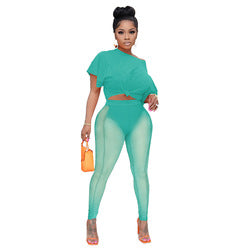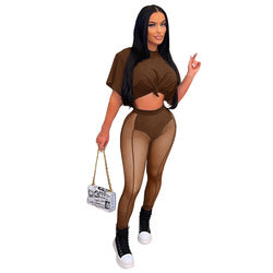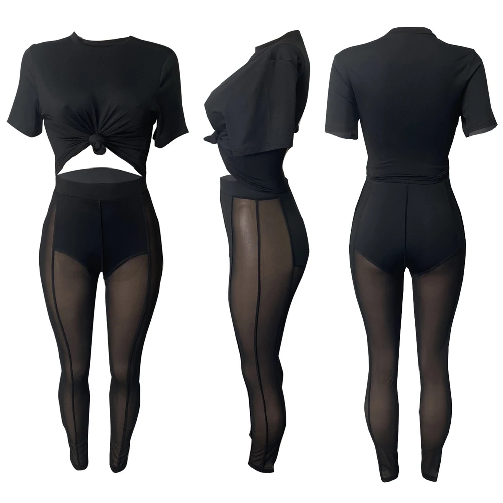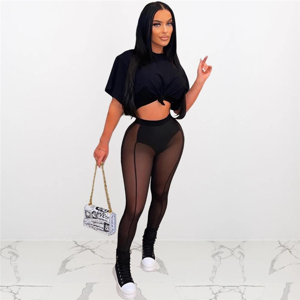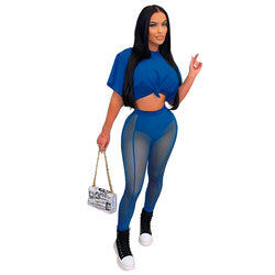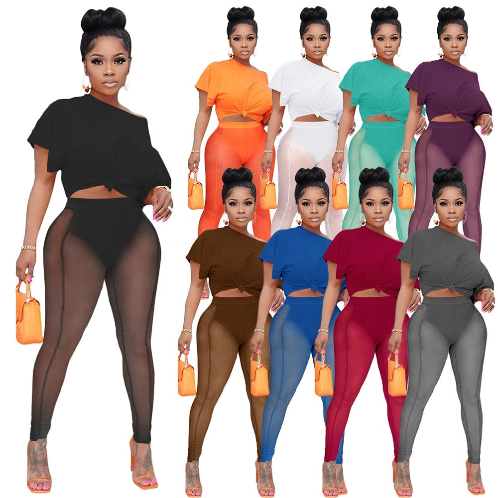 2022 popular design sexy solid color t-shirt mesh pants women's two piece sets club outfits