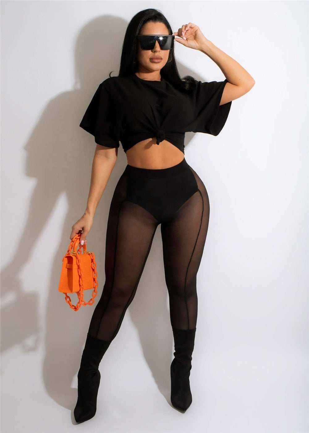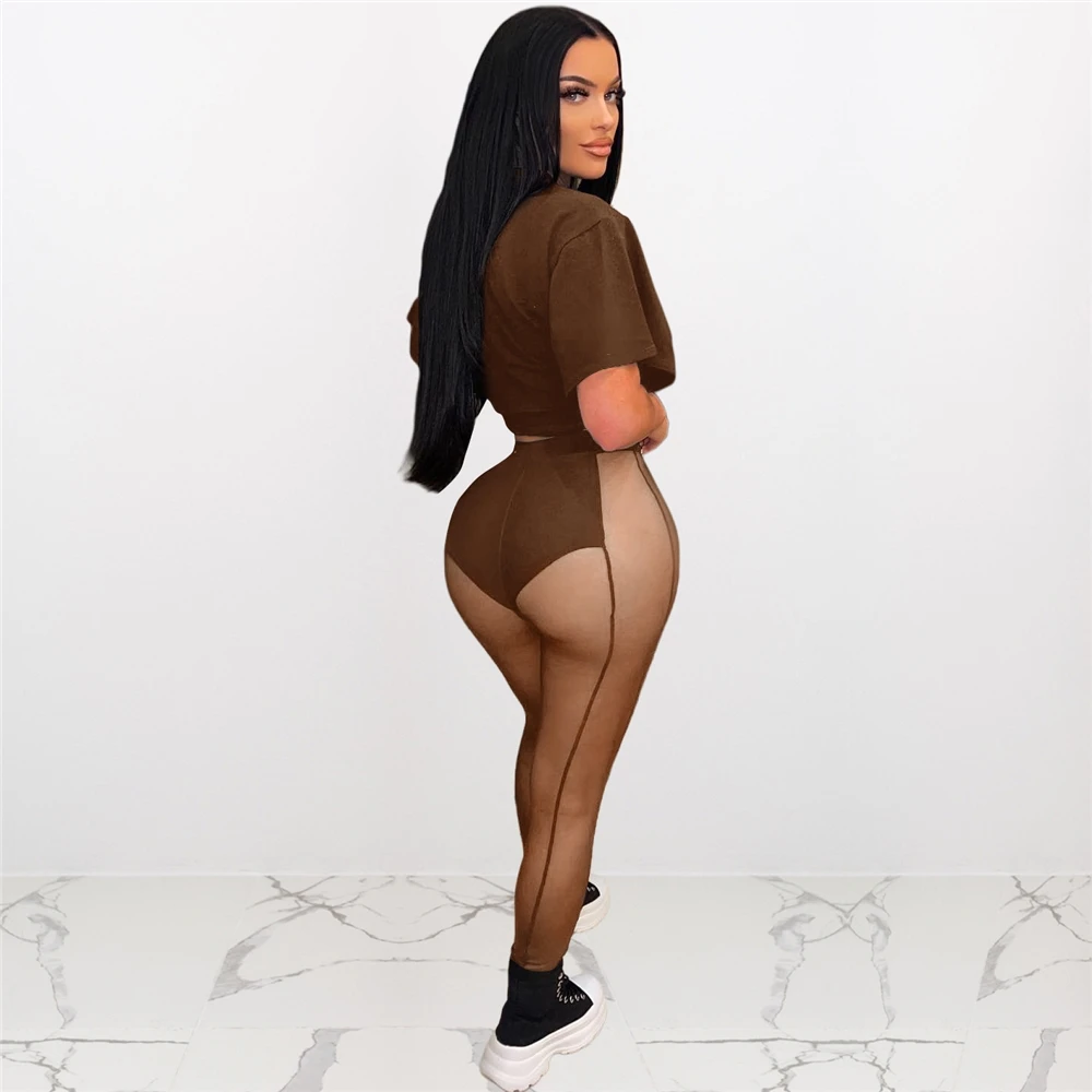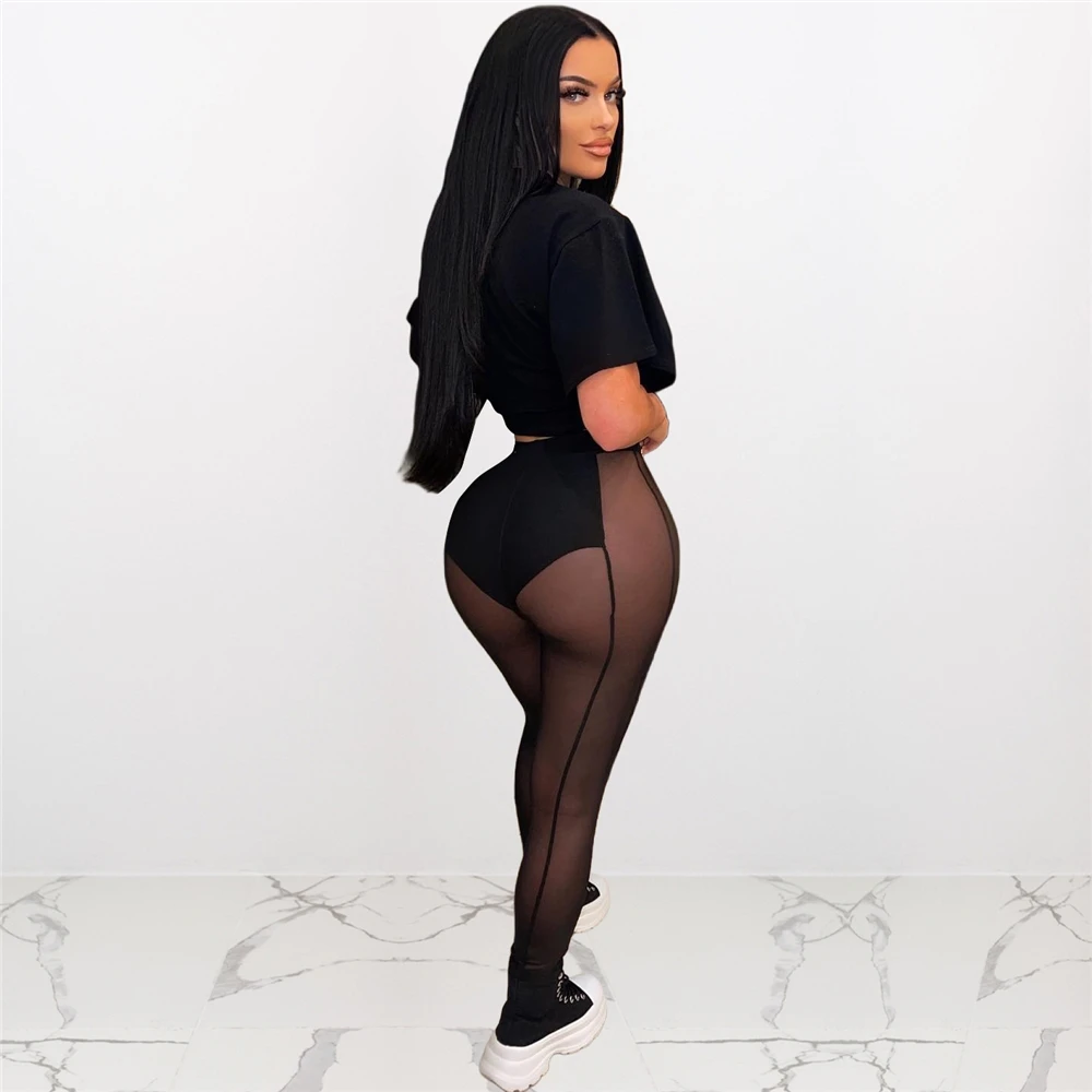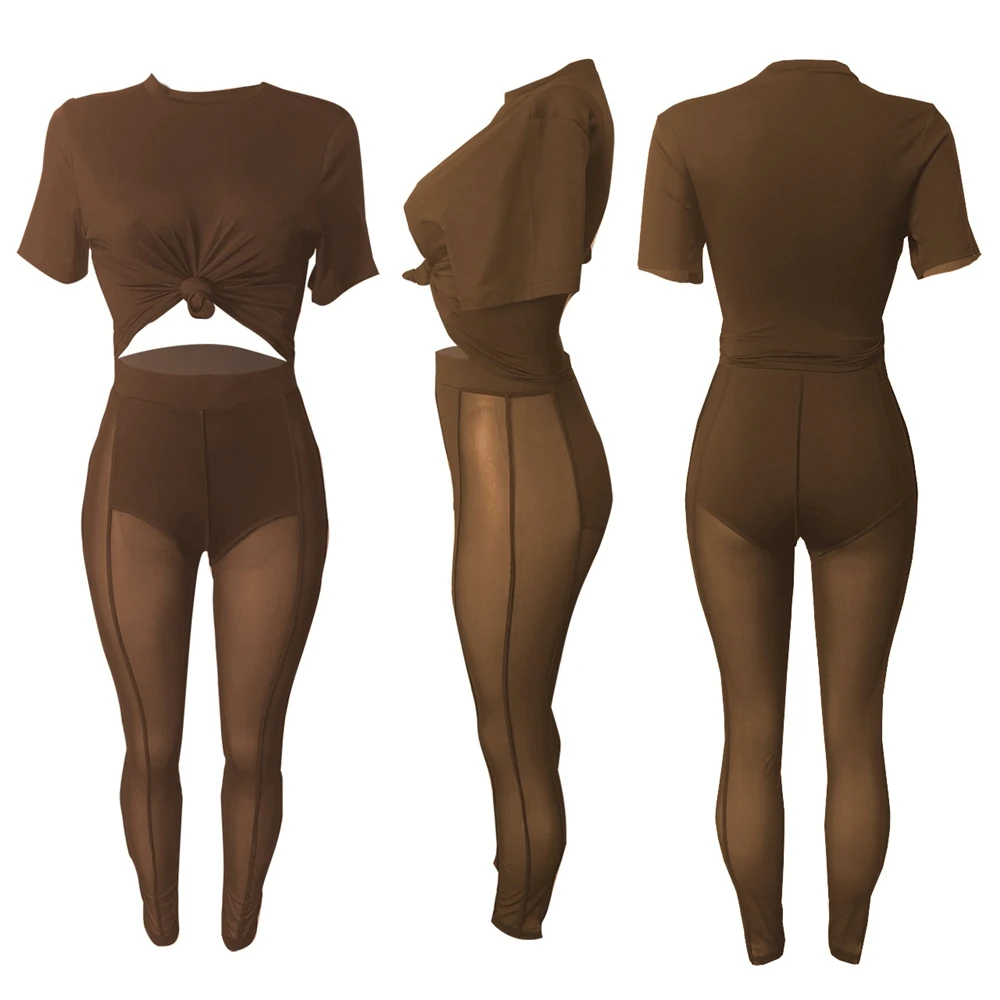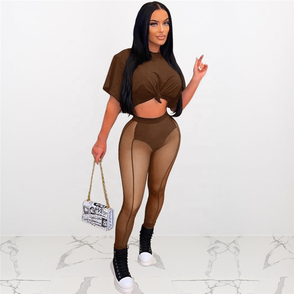 2022 popular design sexy solid color t-shirt mesh pants women's two piece sets club outfits