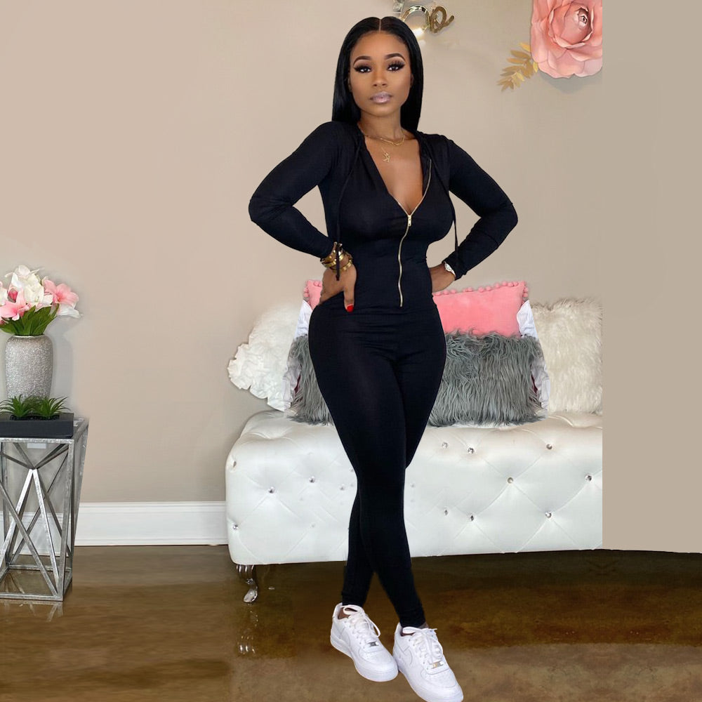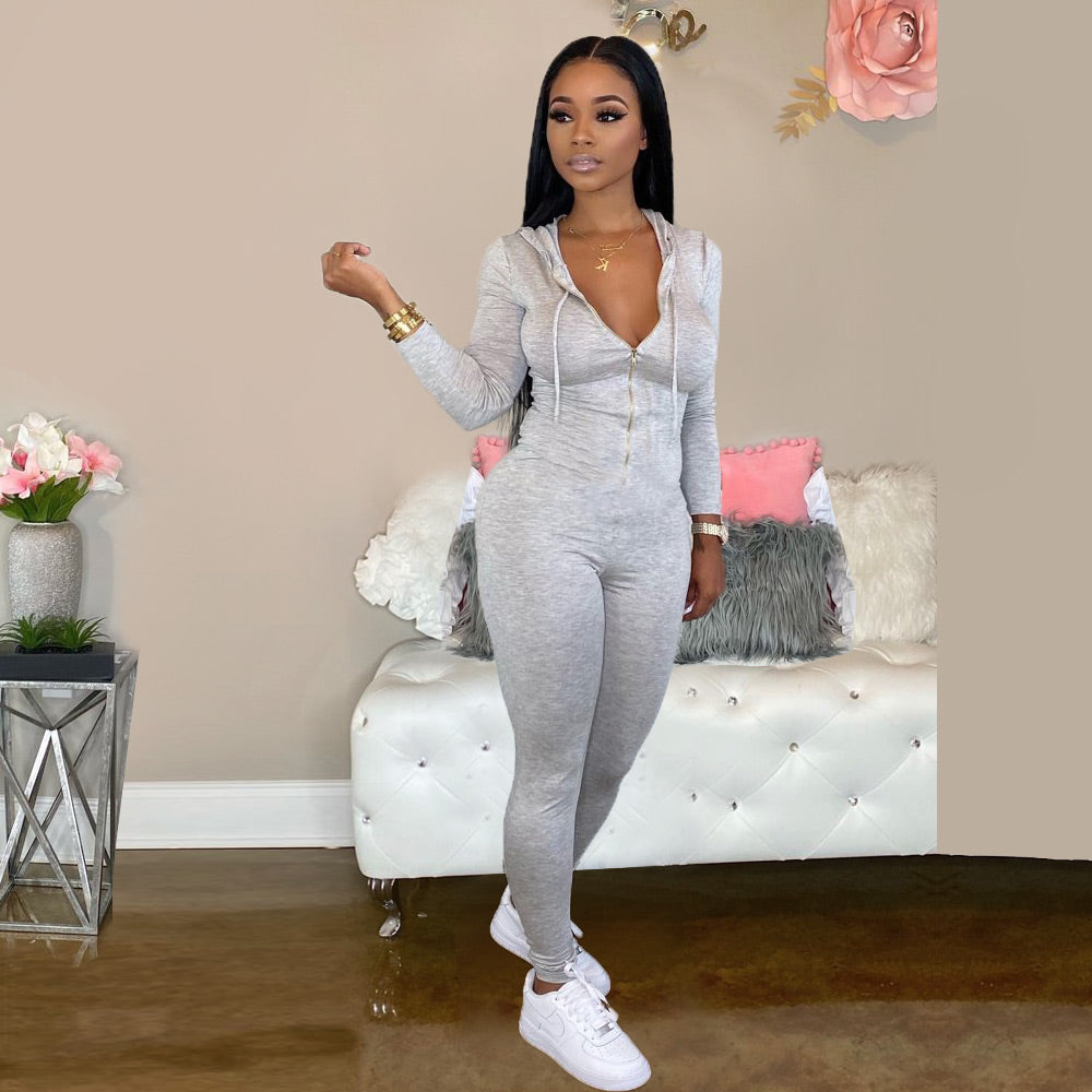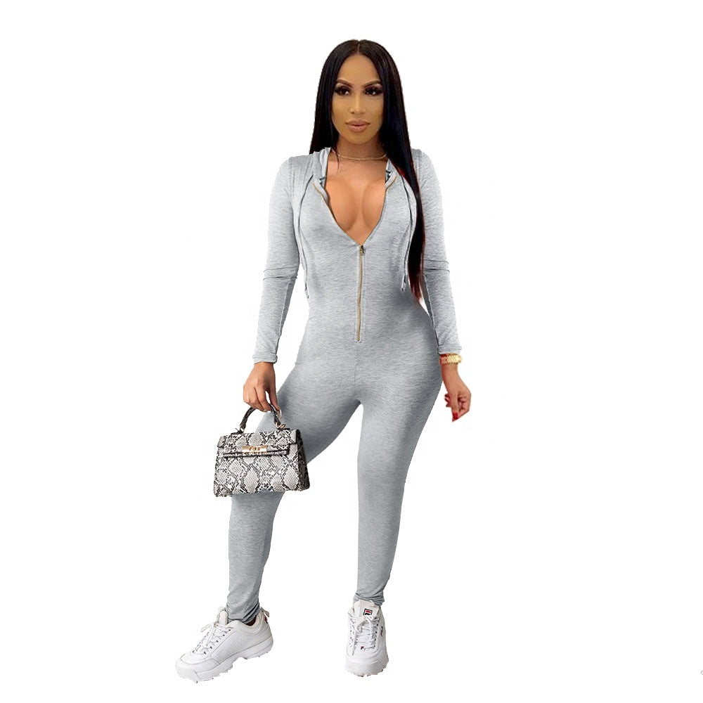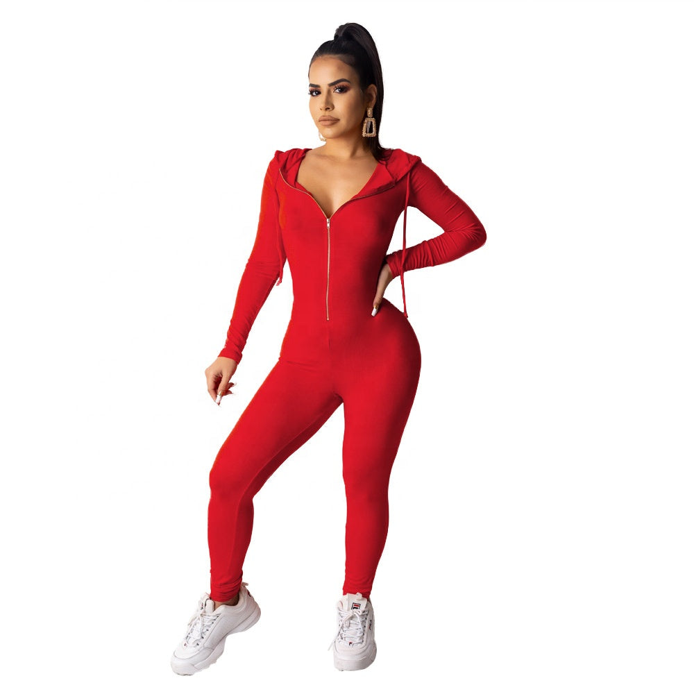 Hot Sale Autumn Women Solid Color Zip Front Long Sleeve Hoodie One Piece Jumpsuit