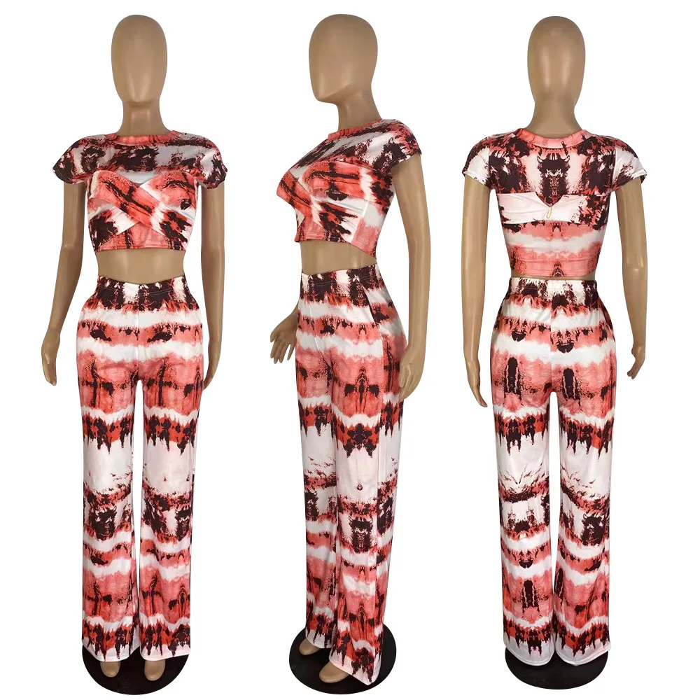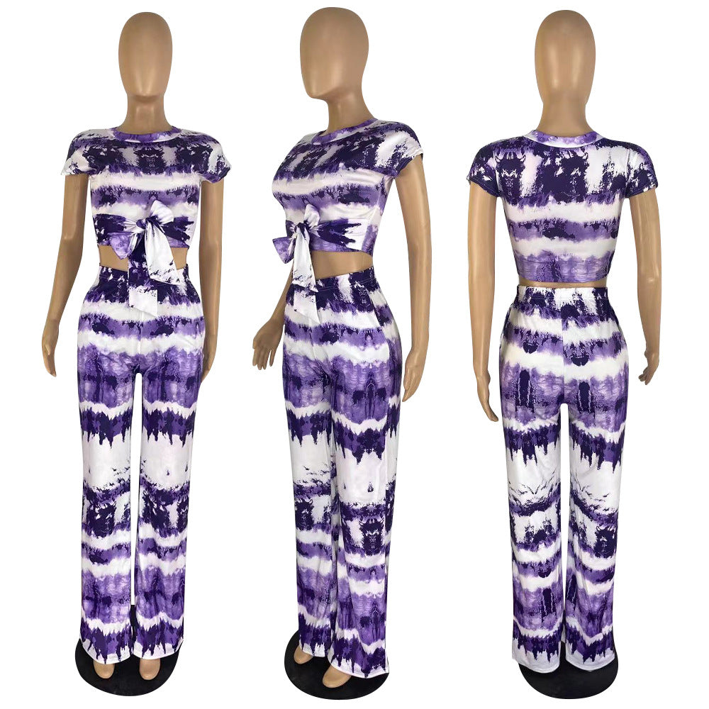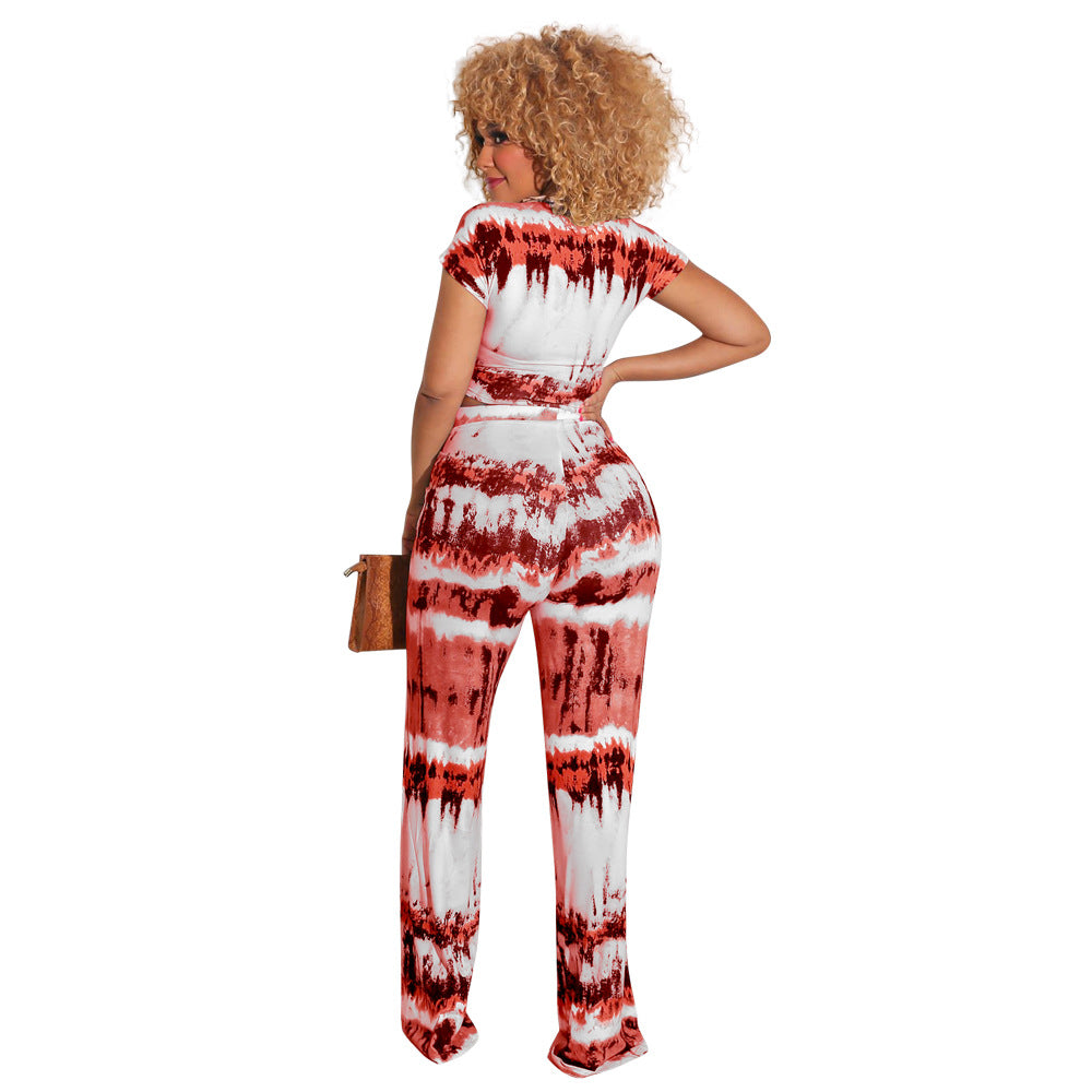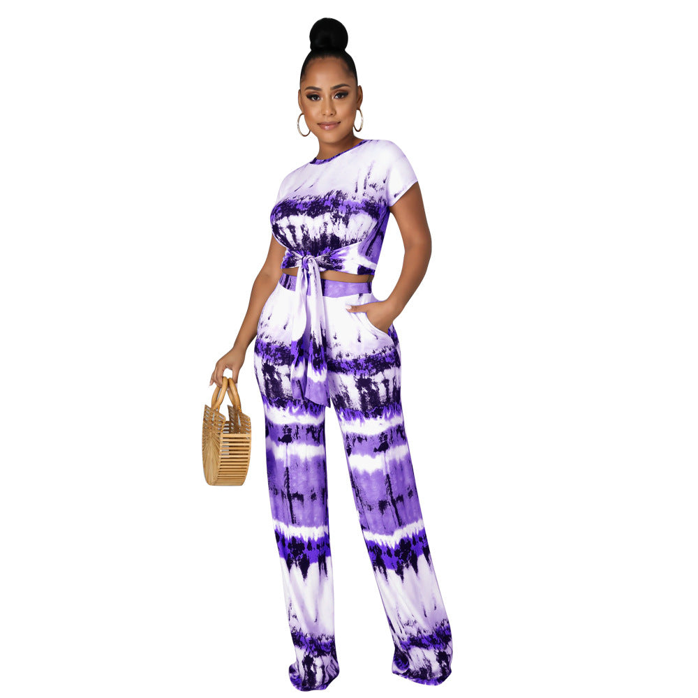 printed tie-dye short-sleeve strappy double-pocket loose wide-leg pants two-piece trousers
