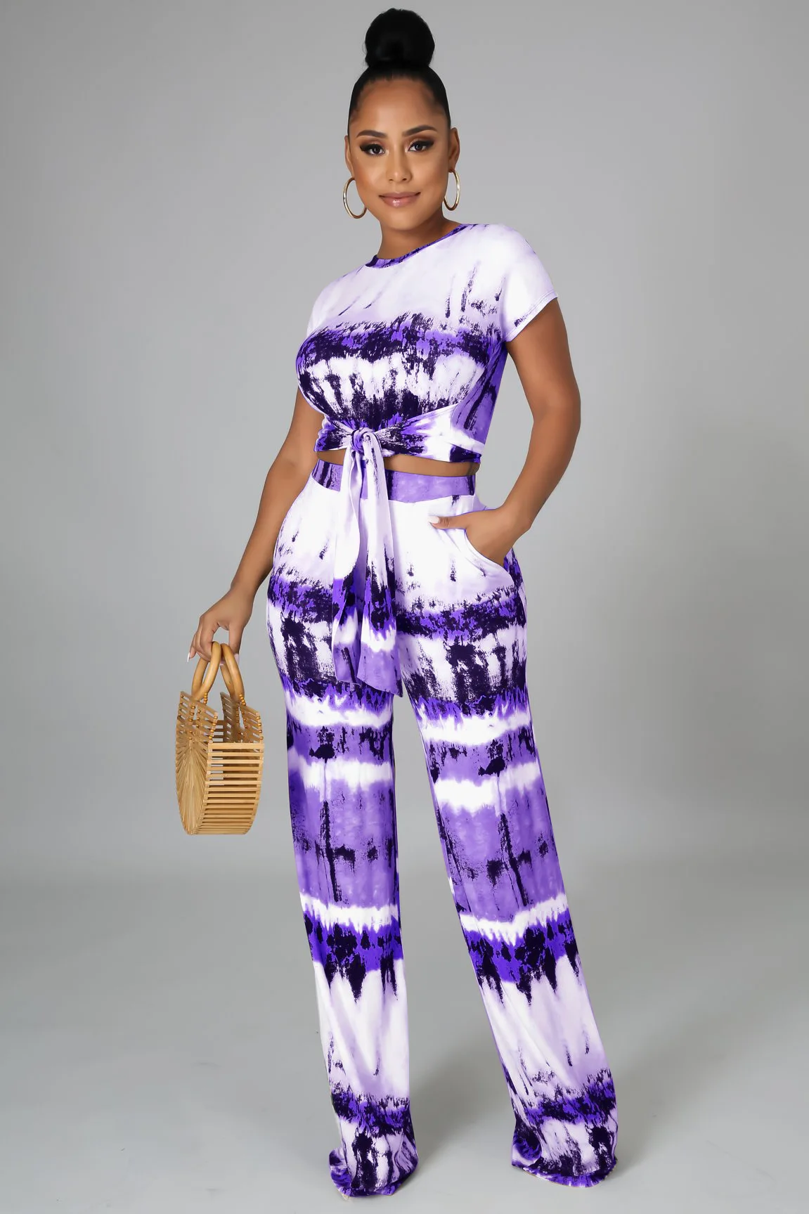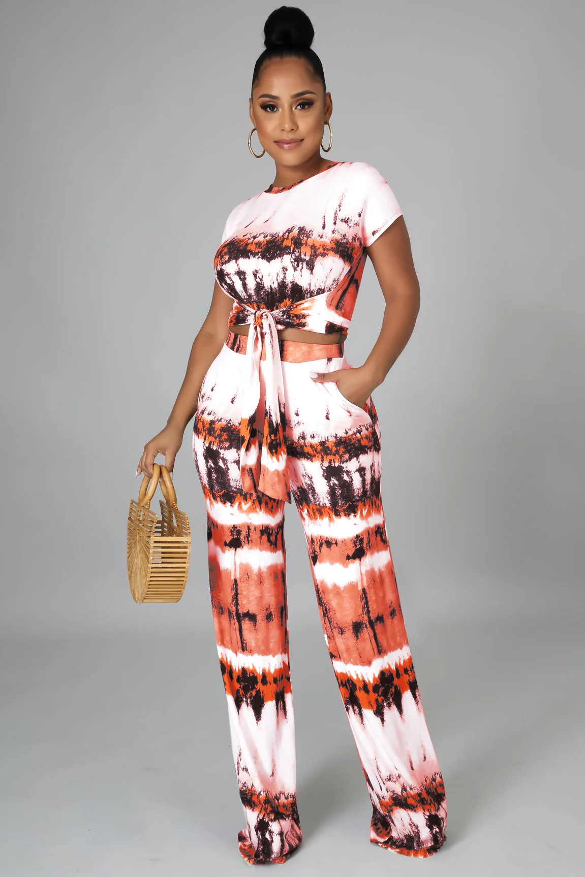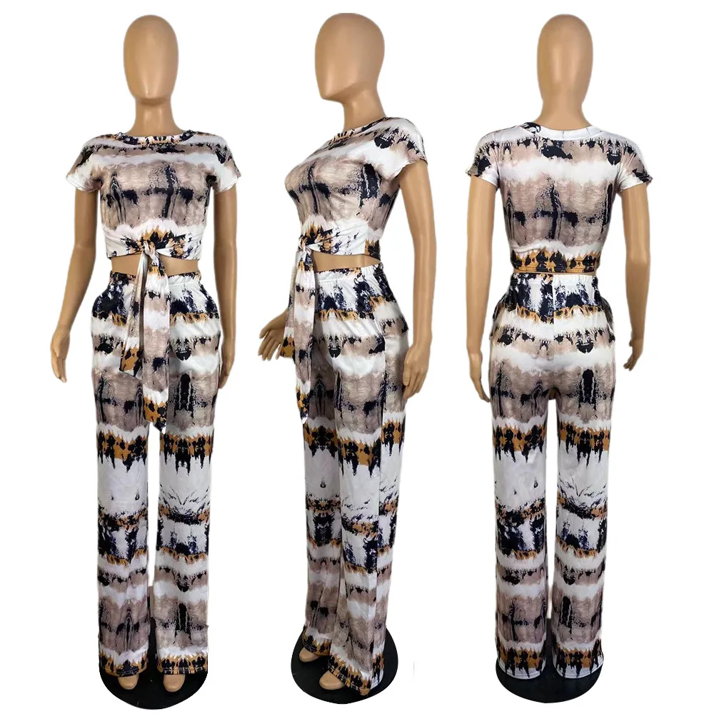 printed tie-dye short-sleeve strappy double-pocket loose wide-leg pants two-piece trousers