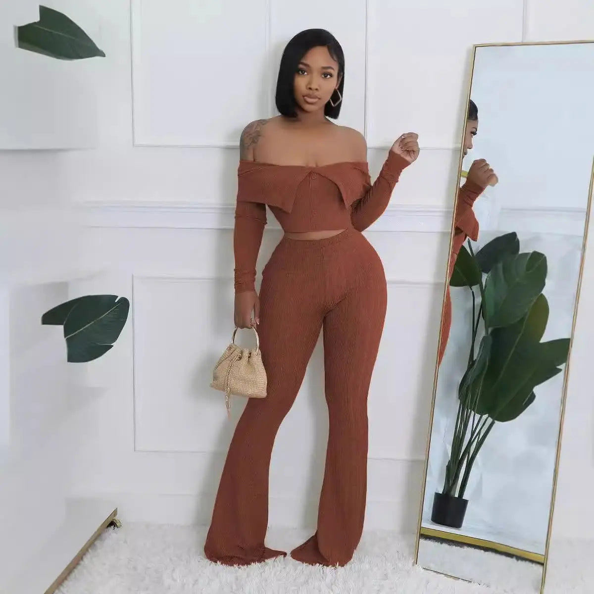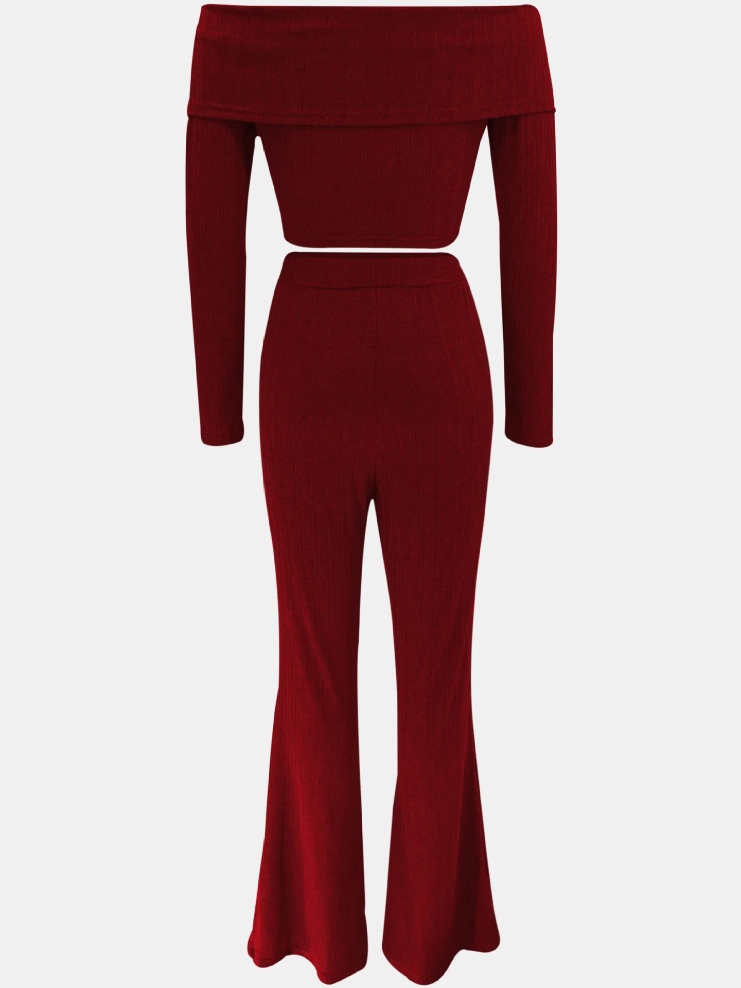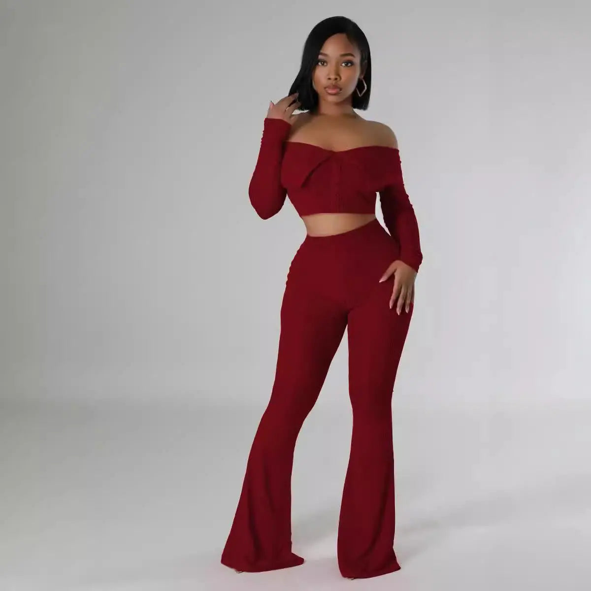 Off-shoulder Long Sleeve Top Long Wide Leg Pants Women's Solid Color 2-Piece Set Sehe Fashion