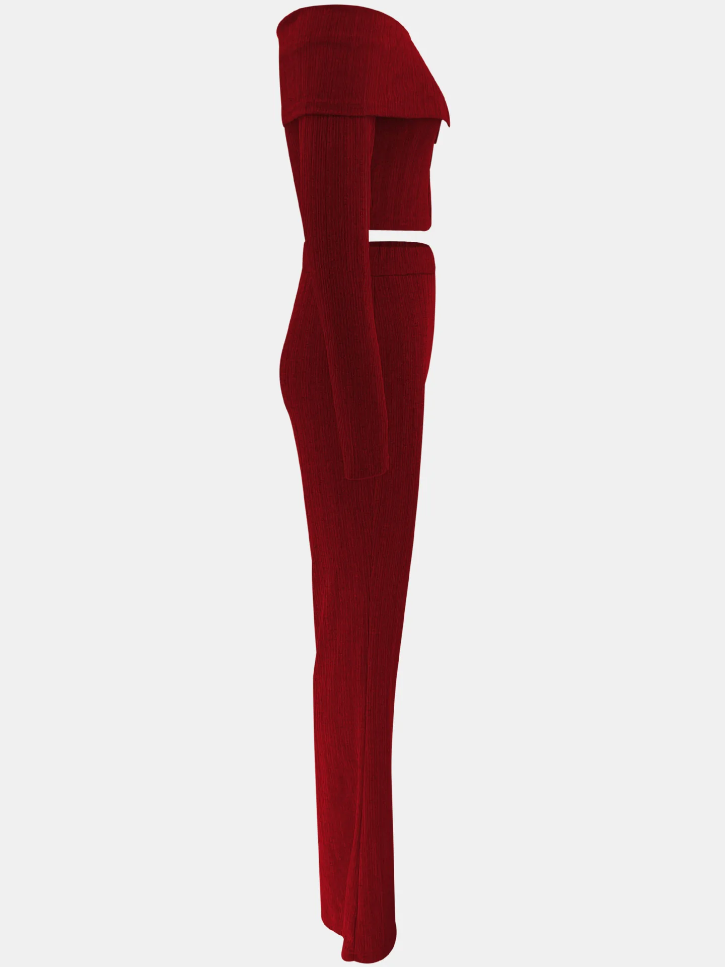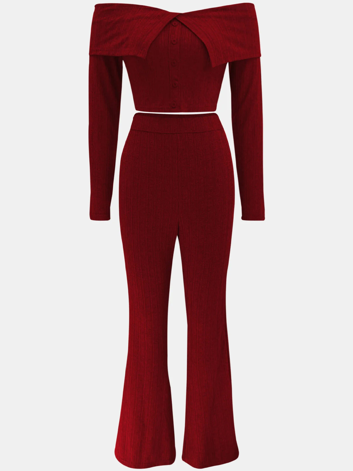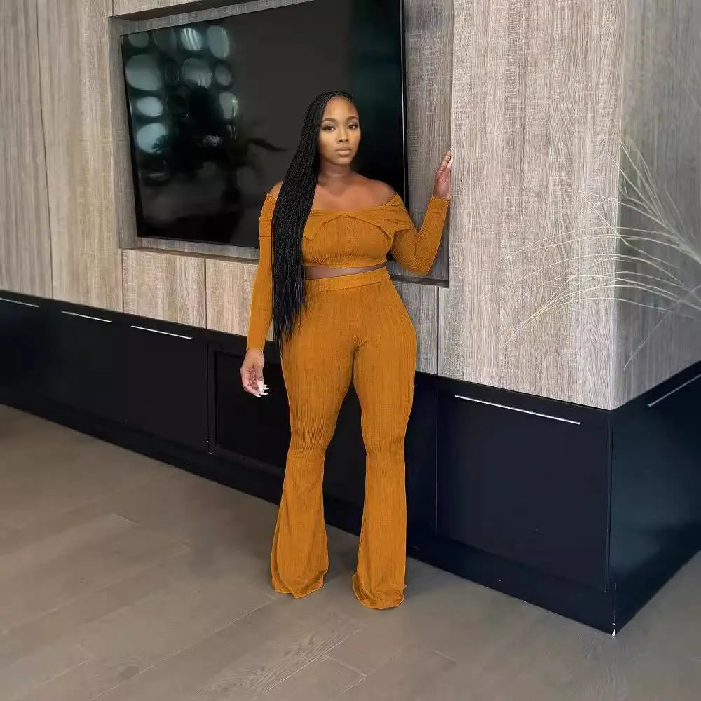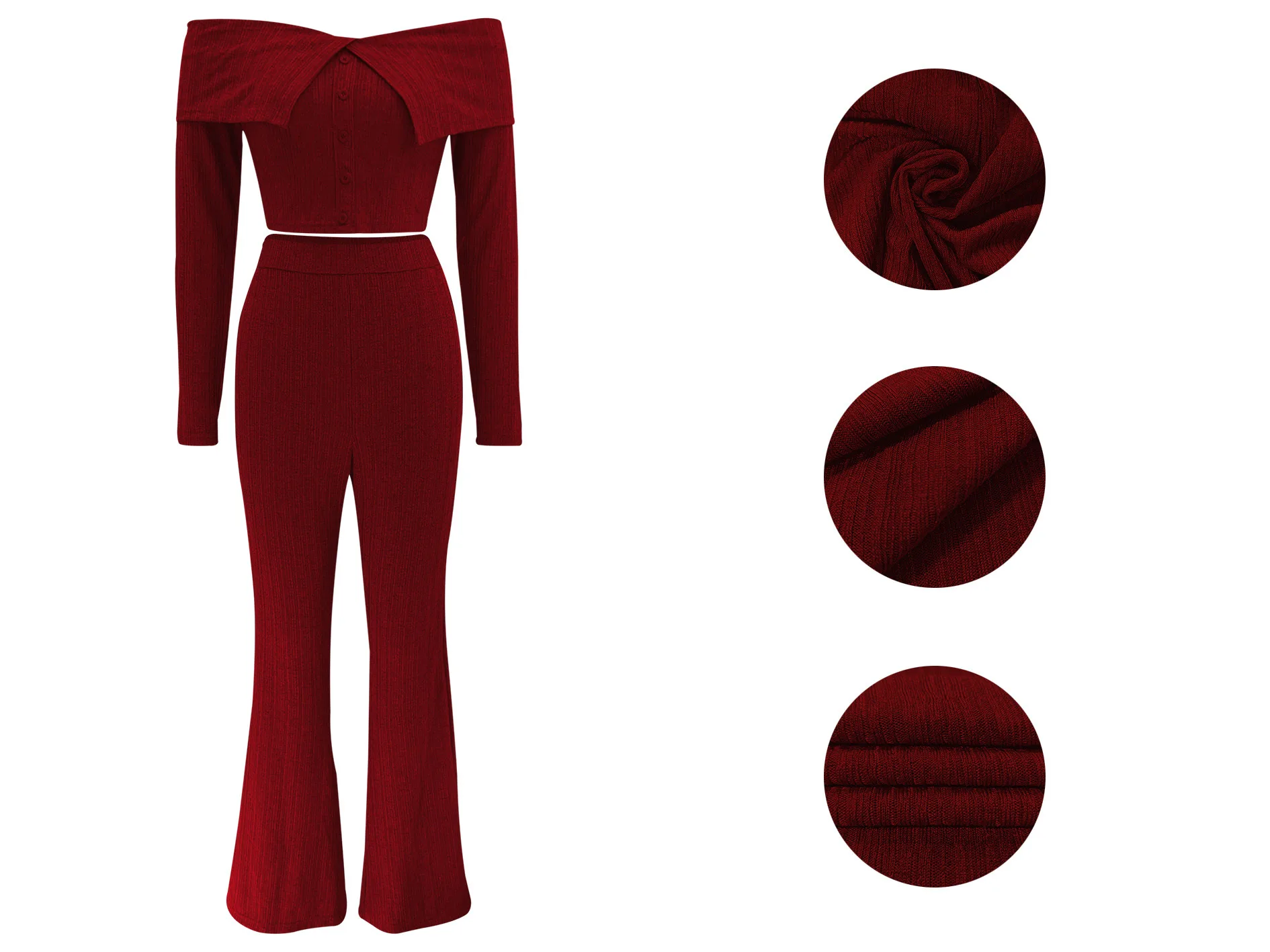 Off-shoulder Long Sleeve Top Long Wide Leg Pants Women's Solid Color 2-Piece Set Sehe Fashion