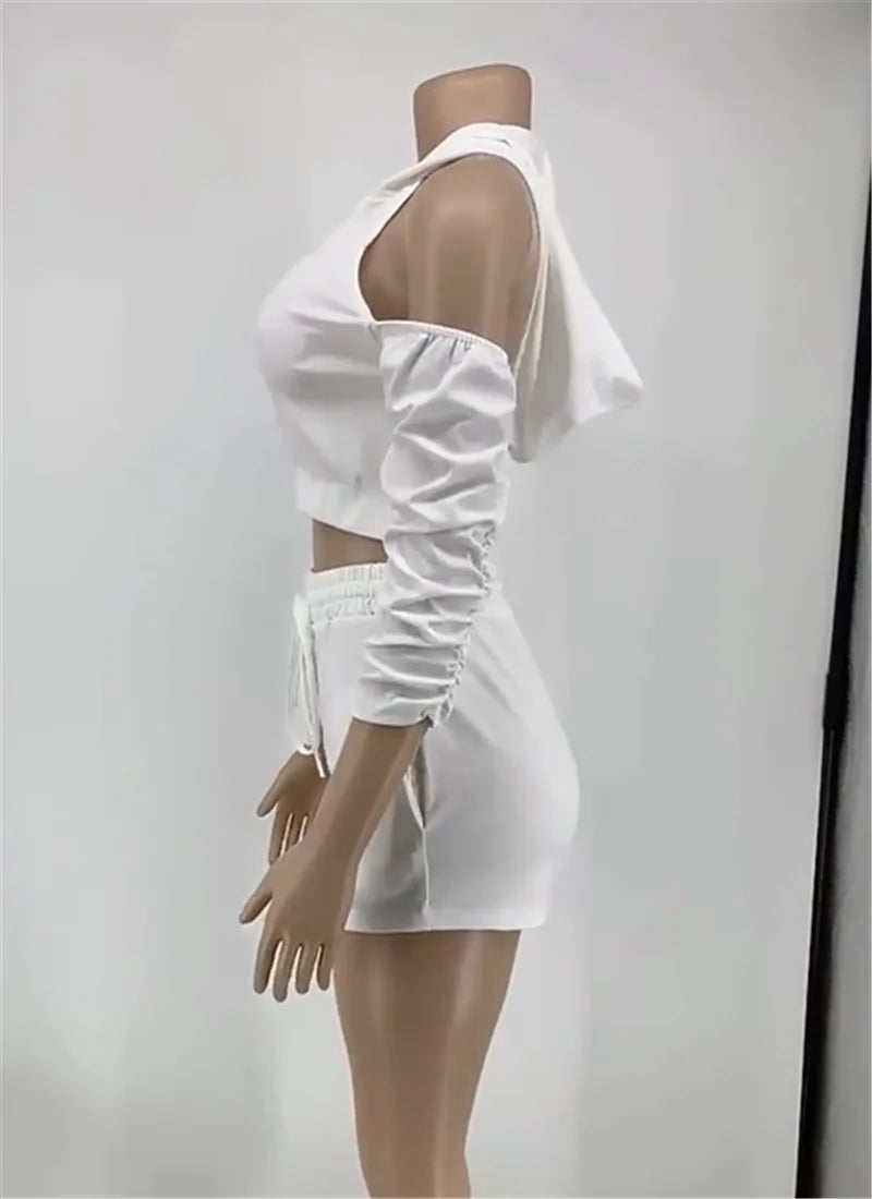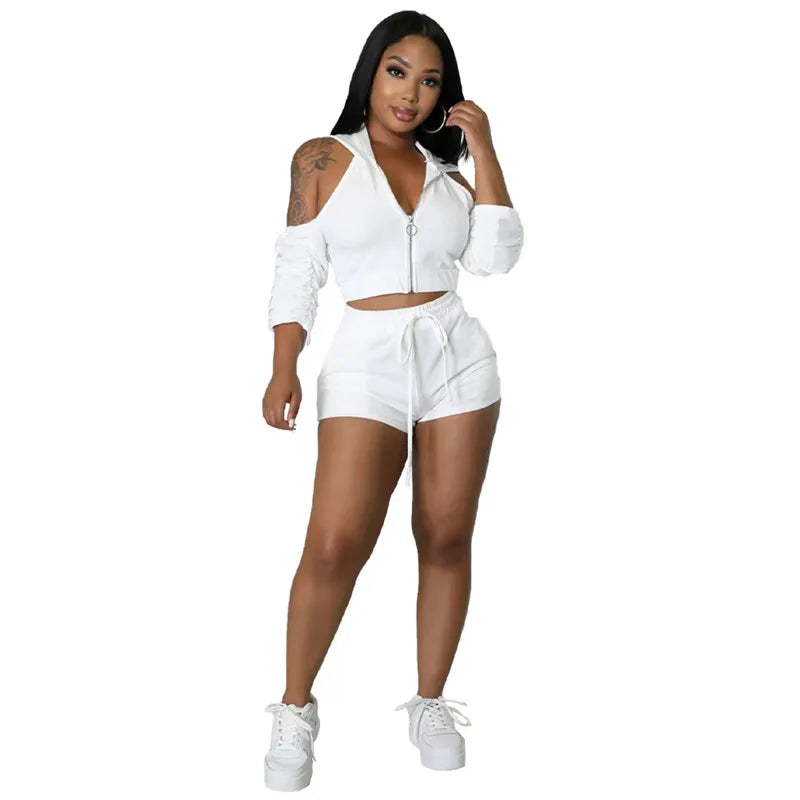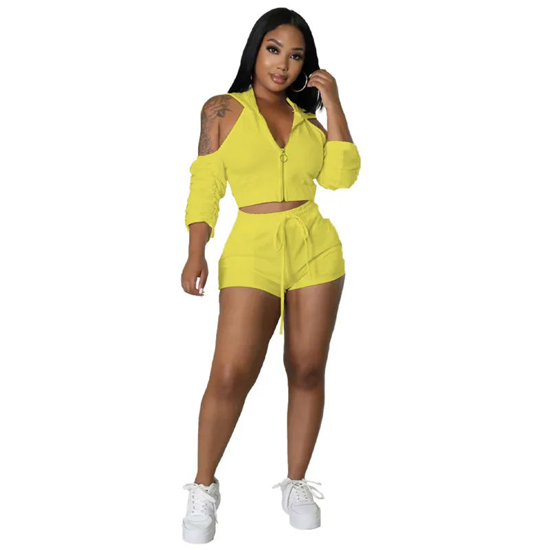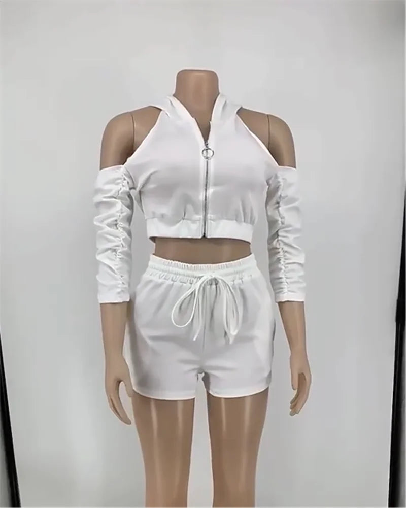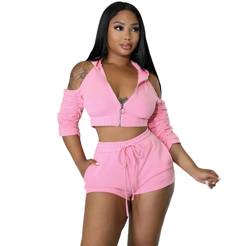 Solid Color Zip Pleated Sleeves Sexy Backless Women Sweatsuit Set Tracksuit Two Piece Set Women Clothing Shorts
