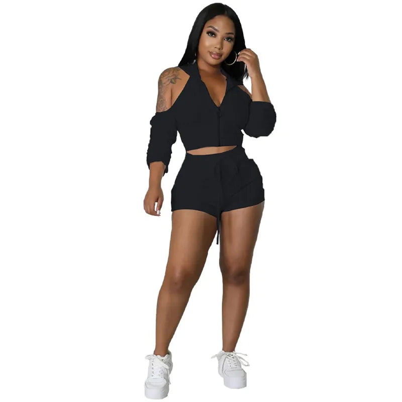Product Name Solid Color Zip Pleated Sleeves Sexy Backless Women Sweatsuit Set Tracksuit Two Piece Set Women Clothing Shorts